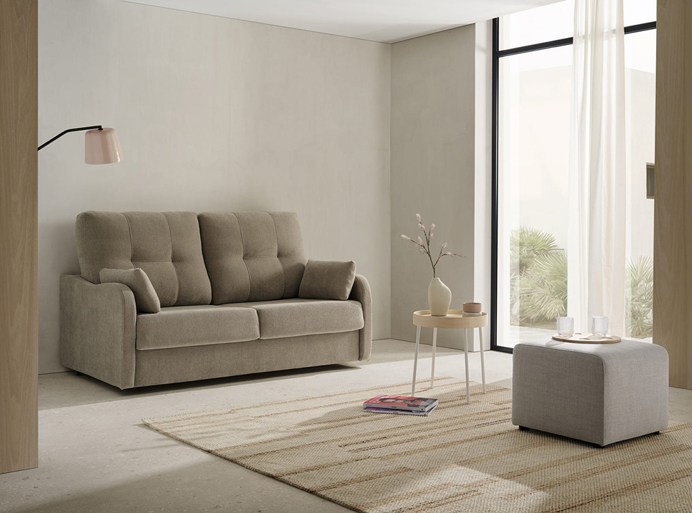 Mopal Matelas de 14 cm Dimensions : l 116/... x h x p cm Le canapé-lit Mini est parfait pour les petits espaces, offrant une fonctionnalité sans sacrifier le style. Son design compact et moderne le rend polyvalent. MÉCANISME: Italien. Acier électrosoudé et grille métallique. STRUCTURE: Bois de pin, renforcé avec panneaux de particules. COUSSIN DE SIÈGE : Mousse de polyuréthane 30 kg/m3 recouvert de fibre de polyester. COUSSIN DE DOSSIER : Fibre creuse siliconée avec flocons de caoutchouc mousse. AMOVIBLE: Coussins d'assise, de dossier et de coussin. MATELAS: Longueur 190 cm, Épaisseur 14 cm. Caoutchouc mousse HR 30 kg. rembourré. OPTIONS: Matelas Visco-HR avec rehausse.
