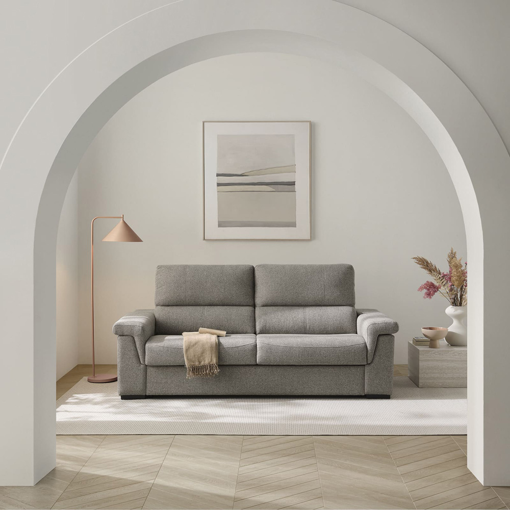 Mopal Dimensions : l 116/... x h x p cm MÉCANISME: Italien. Acier galvanisé soldat et grille métallique. STRUCTURE: Bois de pin, renforcé avec panneaux de particules. COUSSIN DE SIÈGE : Mousse de polyuréthane 35 kg/m3 recouvert de fibre de polyester. COUSSIN DE DOSSIER : Fibre creuse siliconée. AMOVIBLE: Coussins d'assise, de dossier et d'accoudoirs. MATELAS: Longueur 195 cm, Épaisseur 16 cm. Caoutchouc mousse HR 30 kg. rembourré PATTES : Polnuméro injecté noir. OPTIONS: Matelas Visco-HR avec rehausse. canapé lit